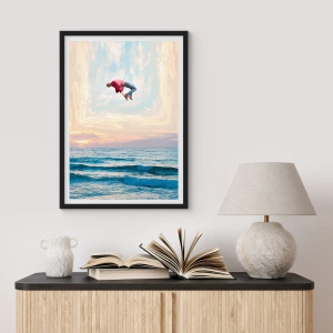Plagát v čiernom ráme - Muž skáče do neba nad oceánom pri západe slnka - 50x70cm - Do inej dimenzie - Moderná nástenná dekorácia do obývacej izby a spálne ARTTOR