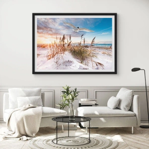 Plagát v čiernom ráme - Vták letí nad dunami a morom pri západe slnka - 50x70cm - Vietor od mora - Moderná nástenná dekorácia do obývacej izby a spálne ARTTOR