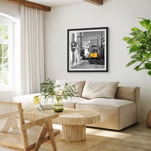 Plagát v čiernom ráme - Žltá električka na uliciach mesta v čiernobielom prostredí - 50x70cm - Duch Lisabonu - Moderná nástenná dekorácia do obývacej izby a spálne ARTTOR