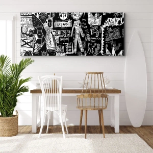 - Táto plátenná tlač s rozmermi 70x50 cm predstavuje čiernobielu koláž inšpirovanú mestským pouličným umením. Ideálna do expresívnych, moderných interiérov.