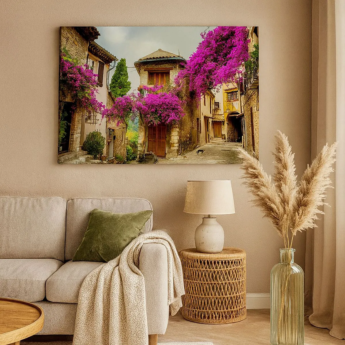 - Táto plátenná tlač s rozmermi 70x50 cm zobrazuje kamennú ulicu lemovanú ružovými kvetmi bugenvílie a malebnými domami. Ideálna do romantických interiérov.