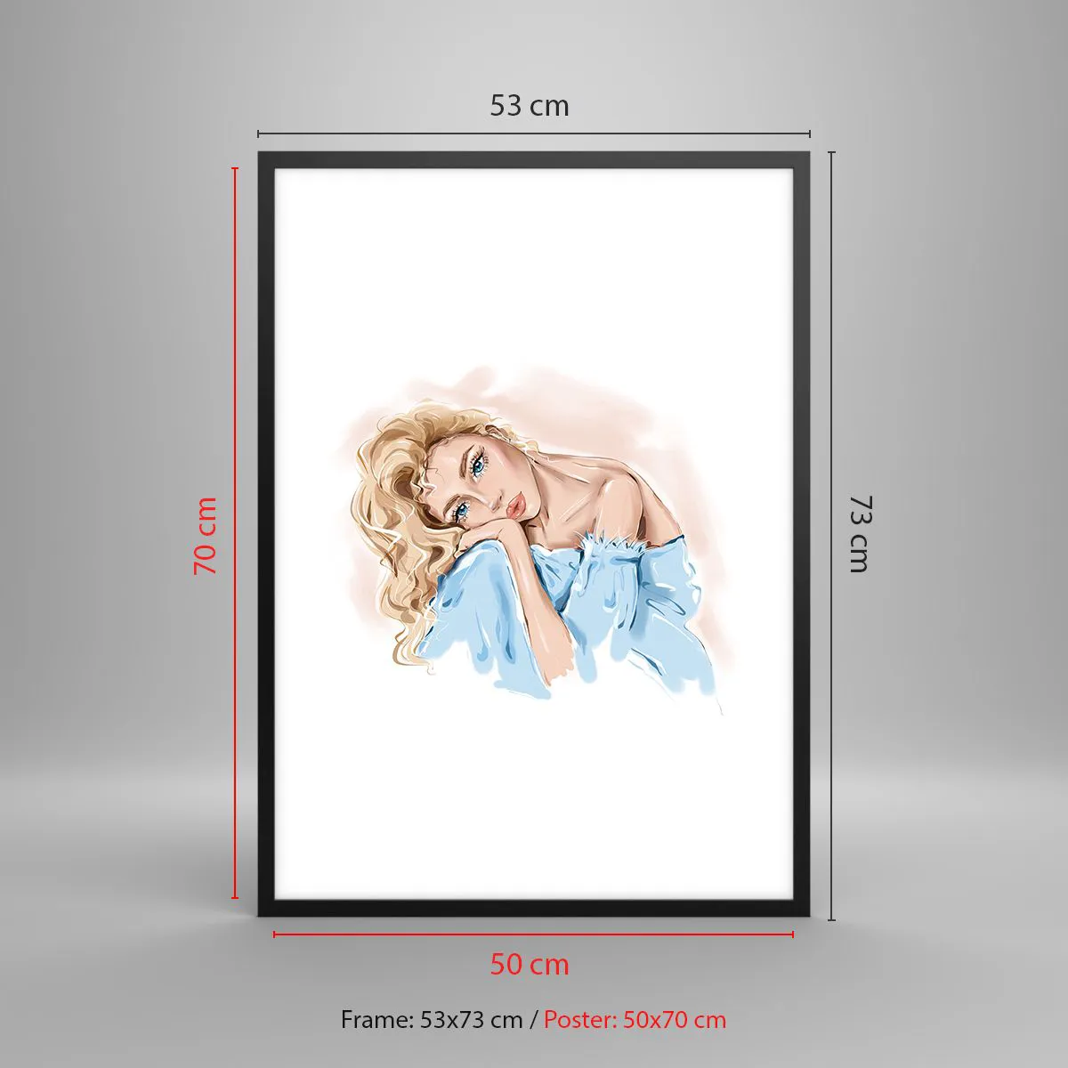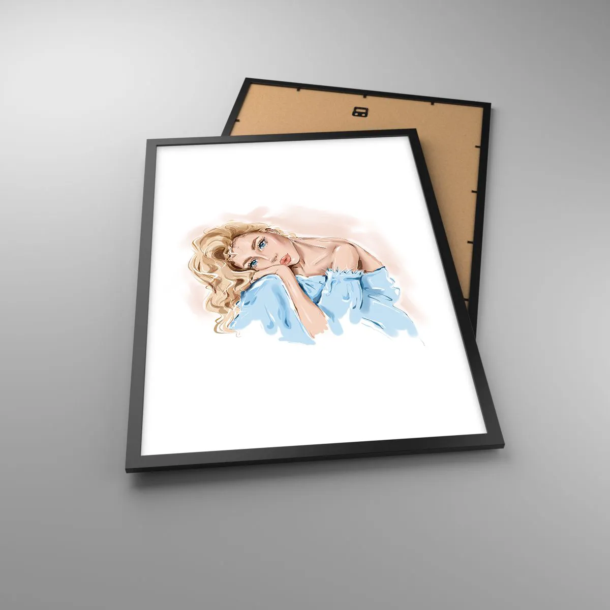 Plagát v čiernom ráme - Jemný portrét ženy v jemných farbách - 50x70cm - Zasnená v modrej - Moderná nástenná dekorácia do obývacej izby a spálne ARTTOR