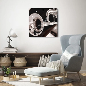Nástenné hodiny - Čiernobiely detailný záber trúbky v umeleckej snímke - 30x30cm - Hudobné cestovanie do 30. rokov - Moderná nástenná dekorácia do obývacej izby, kuchyne a spálne ARTTOR