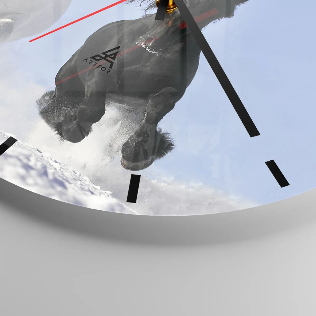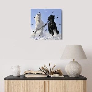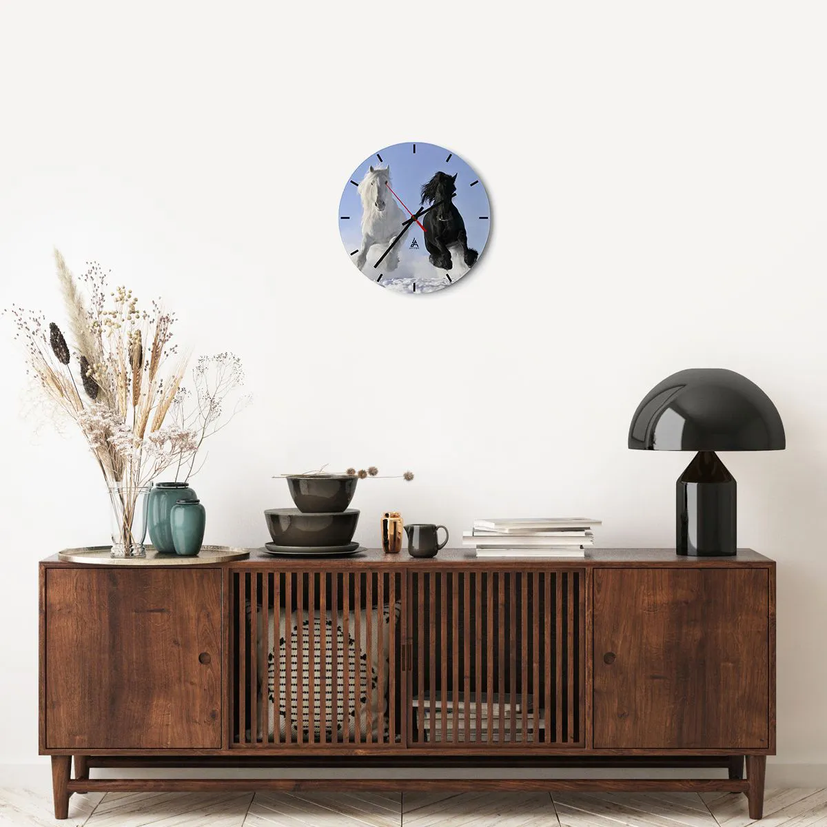 - Nástenné hodiny s motívom čiernobielych koní cválajúcich na pozadí modrej oblohy. Ich moderný dizajn kombinuje dynamiku s eleganciou a prináša harmóniu do každého interiéru.
