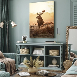 - Obraz na plátne zobrazujúci jeleňa v lúčoch vychádzajúceho slnka, ktorý vnáša do interiéru harmóniu a eleganciu.