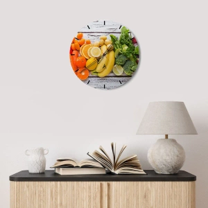 - Tieto nástenné hodiny sa vyznačujú farebným motívom ovocia a zeleniny na drevenom pozadí. Sú ideálne do kuchýň, obývacích izieb alebo jedální. Ich okrúhly formát 30x30 cm dodá každému priestoru svieži nádych.