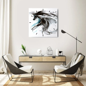 Nástenné hodiny - Tmavý kôň v dynamickom pohybe s rozvetvenou hrivou v umeleckom štýle. - 30x30cm - Cval Čierneho kniežaťa - Moderná nástenná dekorácia do obývacej izby, kuchyne a spálne ARTTOR