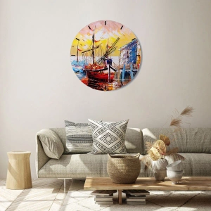 - Tieto nástenné hodiny zobrazujú plachetnice na móle v žiari zapadajúceho slnka. Umelecký dojem, ktorý vnesie pokoj a teplo do každého interiéru.