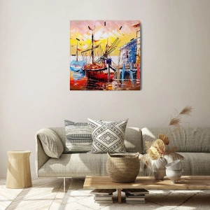 Nástenné hodiny - Plachetnice na móle vo svetle zapadajúceho slnka - 30x30cm - Šťastný návrat - Moderná nástenná dekorácia do obývacej izby, kuchyne a spálne ARTTOR