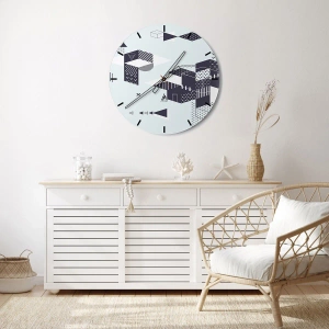 Hodiny sú vyrobené z bezpečného skla s hrúbkou 4mm. Technológia výroby hodín je v súlade s triedou bezpečnosti 2B2 podľa normy PN-EN 12600:2004, ktorá garantuje odolnosť proti nárazom. Hodiny na skle sú pripravené na zavesenie – majú kovový záves upevnený na zadnej strane hodín a penovú dištančnú podložku, ktorá upravuje vzdialenosť hodín od steny. Hodiny majú tichý plávajúci mechanizmus napájaný 1,5 V batériou - AA batéria (batéria nie je súčasťou balenia).