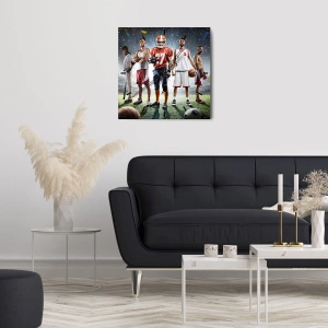 Motív športovcov reprezentujúcich rôzne disciplíny, ako je futbal, basketbal alebo baseball, symbolizuje rozmanitosť a univerzálnosť športu. Pozadie štadióna osvetlené reflektormi vytvára mimoriadnu atmosféru, ktorá pripomína momenty triumfu a adrenalínu spojeného so športovými súťažami. Použitie intenzívnych farieb a dynamických tvarov zdôrazňuje energiu a emócie, ktoré šport prináša.