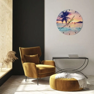 Nástenné hodiny - Večer v zálive - Tropická pláž s palmou pri západe slnka