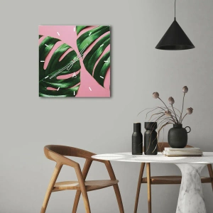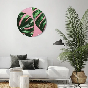 Nástenné hodiny - Green Rendez-Vous - Zelené listy monstery na ružovom pozadí