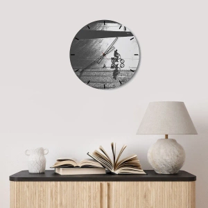 Nástenné hodiny - Čiernobiela silueta cyklistu a jeho odraz v mláke. - 30x30cm - Dopredu, cez mesto - Moderná nástenná dekorácia do obývacej izby, kuchyne a spálne ARTTOR