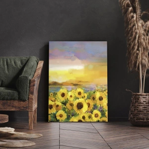 „Slnko samo zostúpilo na zem“ je mimoriadne krásny obraz na plátne zobrazujúci pole slnečníc zahalené v teplom svetle zapadajúceho slnka. Čaro prírody zachytené v tejto kompozícii prináša do interiéru harmóniu a pokoj. Slnečnice, symbolizujúce radosť a energiu, sú zobrazené obklopené intenzívnymi farbami, ktoré zdôrazňujú krásu letnej krajiny.