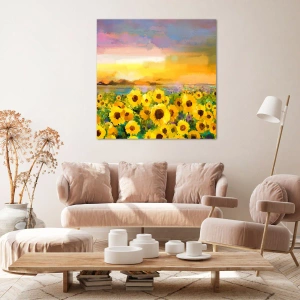 - Očarujúci obraz zobrazujúci pole slnečníc v teplom svetle západu slnka. Krajina plná pokoja a harmónie, ideálna na dekoráciu interiéru.