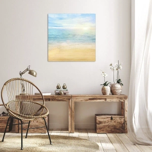 - Obraz zobrazuje pláž s tyrkysovým morom a jemným pieskom, orámovanú jasnou, slnečnou oblohou. Ideálny ako interiérová dekorácia, prináša pokoj, harmóniu a sviatočnú atmosféru.