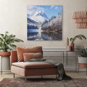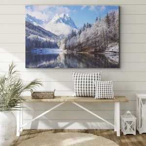 - Obraz zobrazuje zimnú horskú krajinu so zasneženými stromami a pokojným jazerom, ktoré odráža hory v pozadí. Harmonická kompozícia a chladné farby vytvárajú pokojnú dekoráciu, ktorá dokonale dopĺňa interiéry inšpirované prírodou.