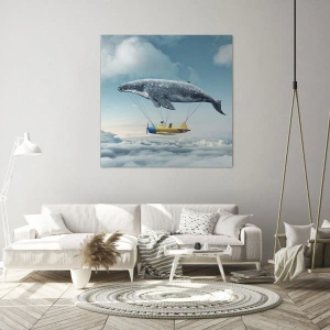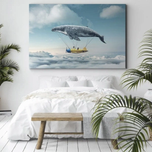 - Obraz zobrazuje surrealistickú scénu letiacej veľryby nesúcej lietadlo. Táto jedinečná kompozícia spája predstavivosť a sen a vytvára rozmarnú dekoráciu, ktorá dokonale dopĺňa moderné a kreatívne interiéry.