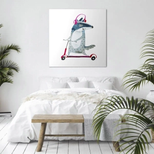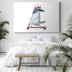 - Obraz zobrazujúci jazveca na kolobežke s ružovými slúchadlami. Hravá dekorácia, ktorá vnesie humor a radosť do každého interiéru.