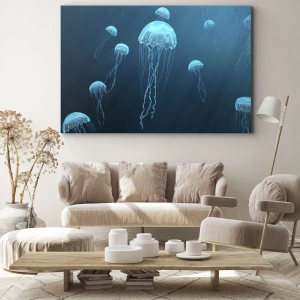 - Tento obraz zobrazuje medúzy plávajúce v hlbinách oceánu v odtieňoch modrej. Ideálne pre milovníkov prírody a morských scenérií.