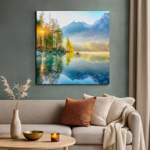 Majestátnosť a sladkosť je mimoriadny obraz s rozmermi 70x50 cm od spoločnosti ARTTOR, ktorý zobrazuje krásnu prírodnú krajinu. Ústredným motívom je jazero obklopené horami a lesom, ktoré sa trblieta v ranných slnečných lúčoch. Odraz krajiny v pokojnej hladine vody dodáva kompozícii hĺbku a jedinečný charakter, pričom zdôrazňuje harmóniu medzi všetkými prvkami prírody.