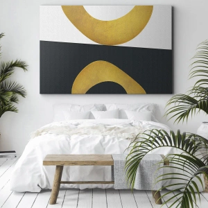 - Obraz zobrazuje geometrické tvary v zlatej farbe na bielom a tmavom pozadí. Moderná a elegantná kompozícia, ktorá sa ideálne hodí do minimalistických interiérov.