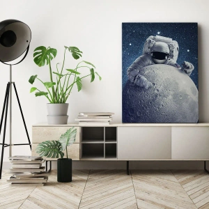 - Obraz zobrazuje astronauta, ktorý drží mesiac na pozadí hviezdnej oblohy. Kozmická a inšpiratívna kompozícia, ktorá sa dokonale hodí do moderných interiérov.