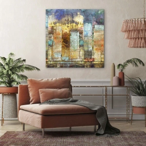 Horizontálna tlač na plátno s rozmermi 70x50 cm „Slnečná metropola“ predstavuje jedinečnú kompozíciu abstraktných mrakodrapov v industriálnom štýle. Bohatá textúra a dynamická hra farieb dodávajú dielu moderný a umelecký charakter.