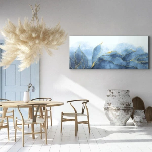 - Obraz s abstraktnými vlnami v odtieňoch modrej s jemnými zlatými akcentmi, ideálny do moderného interiéru.