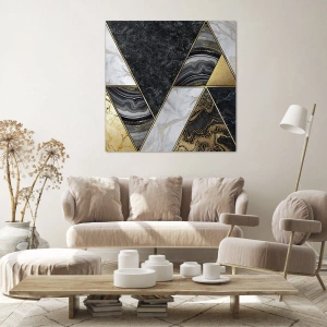 - Obraz zobrazujúci geometrické trojuholníky v zlatých, mramorových a tmavých odtieňoch, ideálny do moderných interiérov s elegantným charakterom.