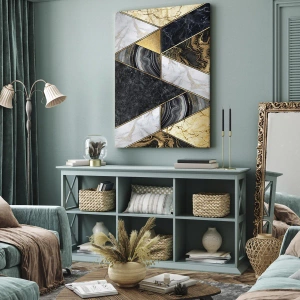 Vďaka použitiu zlatých akcentov prináša obraz do priestoru luxusný charakter, zatiaľ čo mramorové detaily a tmavé farby mu dodávajú hĺbku a jemnosť. Minimalistický dizajn robí z diela perfektnú dekoráciu do obývačky, spálne alebo kancelárie.