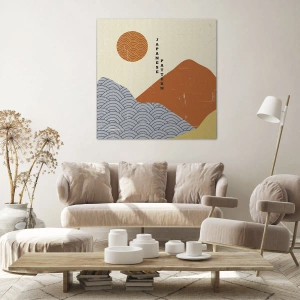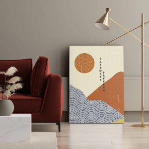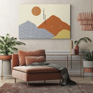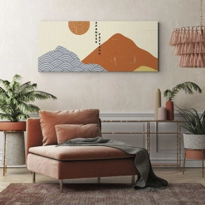 - Tento obraz v japonskom štýle predstavuje minimalistickú kompozíciu hôr, slnka a tradičných vzorov, ktoré vytvárajú jemnú harmóniu. Je ideálny do moderných interiérov, pretože zdôrazňuje ich eleganciu a umelecký výraz.