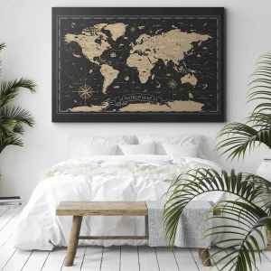 - Obraz zobrazuje štylizovanú mapu sveta na čiernom pozadí s béžovými akcentmi, čím dokonale kombinuje klasický a moderný štýl. Je ideálnou dekoráciou do kancelárií, obývacích izieb alebo vzdelávacích priestorov.
