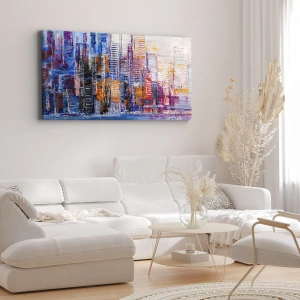- Obraz zobrazuje farebnú mestskú krajinu s odrazmi na vode, zachytávajúc radosť a energiu modernej metropoly. Je to perfektný doplnok do každého moderného interiéru.
