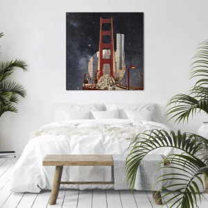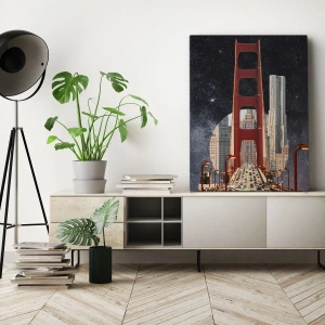- Tento obraz s mostom Golden Gate s mestom v pozadí na pozadí hviezdnej oblohy spája modernosť s harmóniou. Je ideálny do súčasných interiérov.