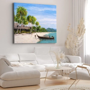 Nástenné umenie - Exotický sen - Exotická pláž s palmami a loďkou na brehu