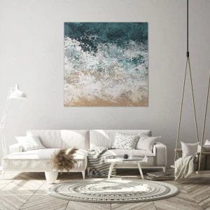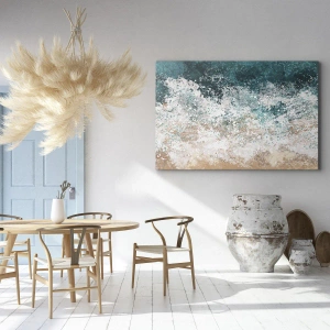 - Obraz „Morské príbehy“ zobrazuje abstraktnú morskú vlnu v tyrkysových a béžových tónoch. Rozmery obrazu sú 70 x 50 cm a sú na šírku ideálne do moderného interiéru.