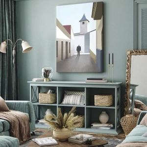 - Obraz zobrazuje minimalistickú ulicu so siluetou muža v diaľke. Pokojná kompozícia dodáva interiéru eleganciu a harmóniu.