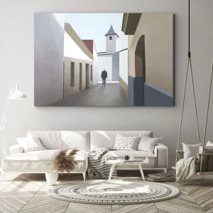 Slnečná prechádzka je decentný obraz na plátne, ktorý poteší svojím minimalistickým štýlom a pokojom. Zobrazuje tichú ulicu s jemnou mužskou siluetou v diaľke, obklopenú jednoduchou architektúrou a tlmenými farbami. Toto umelecké dielo dokonale vnáša do interiéru harmóniu, eleganciu a moderný výraz.