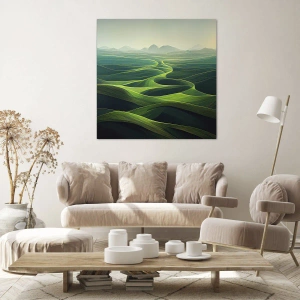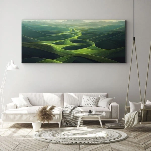 Plátno „V zelených údoliach“ je malebná kompozícia zobrazujúca zelené kopce s vlnitými chodníkmi. Jeho harmonické farby a jemné detaily vytvárajú atmosféru pokoja a inšpirácie, ktorá sa dokonale hodí k moderným interiérom.