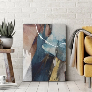 • Moderný abstraktný obraz na plátne s rozmermi 70x50 cm. Dominujú odtiene modrej, zlatej a bielej s dynamickými ťahmi štetcom. Dokonalá nástenná dekorácia do obývačky, spálne alebo kancelárie, ktorá dodá eleganciu a umelecký nádych.