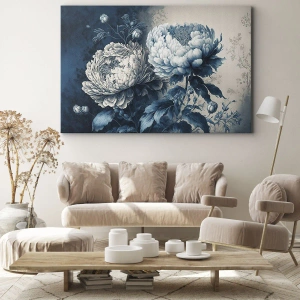 - Tento obraz zobrazuje krásne modré pivonky na jemnom pozadí s jemným vzorom. Je perfektný ako nástenná dekorácia do interiérov v klasickom štýle a prináša eleganciu a harmóniu.
