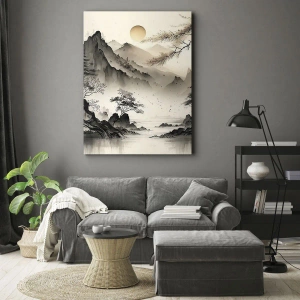 - Táto plátenná tlač s rozmermi 70x50 cm zobrazuje orientálnu krajinu s horami a pagodou v jemných odtieňoch. Ideálna do interiérov inšpirovaných orientálnym umením.