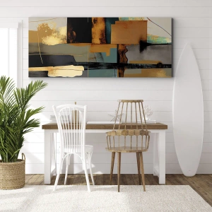 Obraz bol vytvorený na kvalitnom plátne s rozmermi 70x50 cm v horizontálnom formáte. Jeho univerzálny tvar ho robí ideálnym pre rôzne priestory – od obývacích izieb, cez pracovne až po moderné kancelárie. Farebná schéma založená na zlatej a tyrkysovej dodáva interiérom eleganciu a zároveň inšpiruje k kreatívnemu mysleniu.