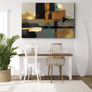 "Abstrakcia - Svetlo a tieň" je obraz, ktorý poteší svojou modernou formou a expresívnou kompozíciou. Abstraktné usporiadanie tvarov a farieb kombinuje odtiene zlatej, tyrkysovej a čiernej a vytvára tak harmonický, no zároveň dynamický celok. Minimalistický štýl obrazu vnáša do interiéru nádych luxusu a sofistikovanosti a zdôrazňuje jeho individuálny charakter.