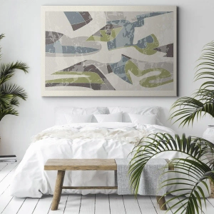 - Moderný obraz s abstraktnými tvarmi v zelenej a modrej farbe na svetlom pozadí. Ideálny do interiérov, ktoré si cenia harmóniu a moderný štýl.