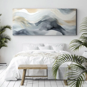 - Tento jemný abstraktný obraz zobrazuje hory v pastelových odtieňoch snehu a hmly. Je to perfektná dekorácia pre škandinávske a moderné interiéry.