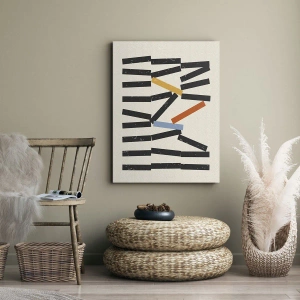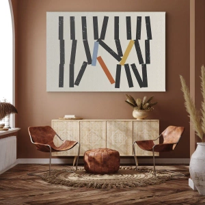 - Táto tlač na plátne predstavuje modernú geometrickú kompozíciu čiernych obdĺžnikov, ktoré sú prerušované farebnými akcentmi. Je perfektným doplnkom minimalistických a moderných interiérov.