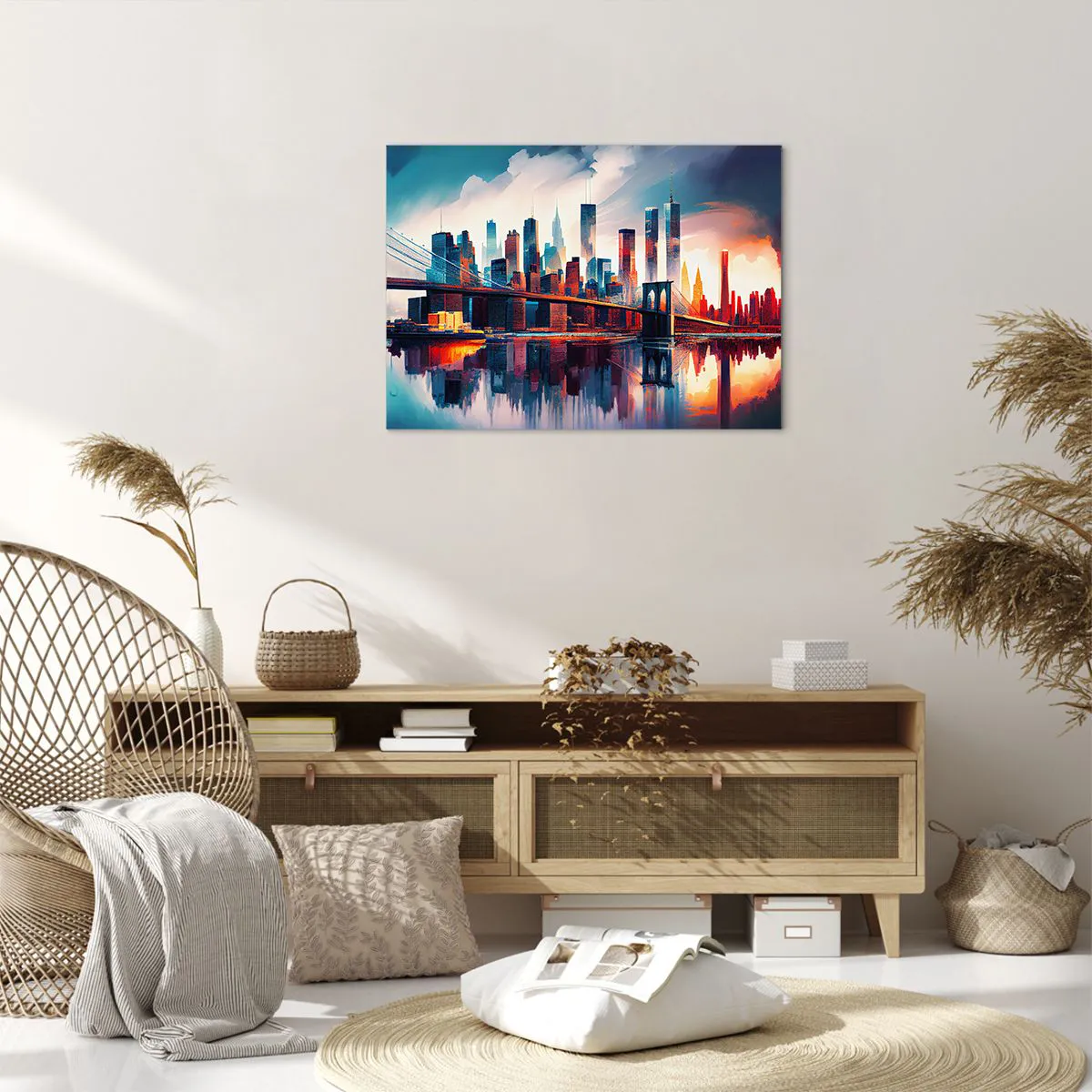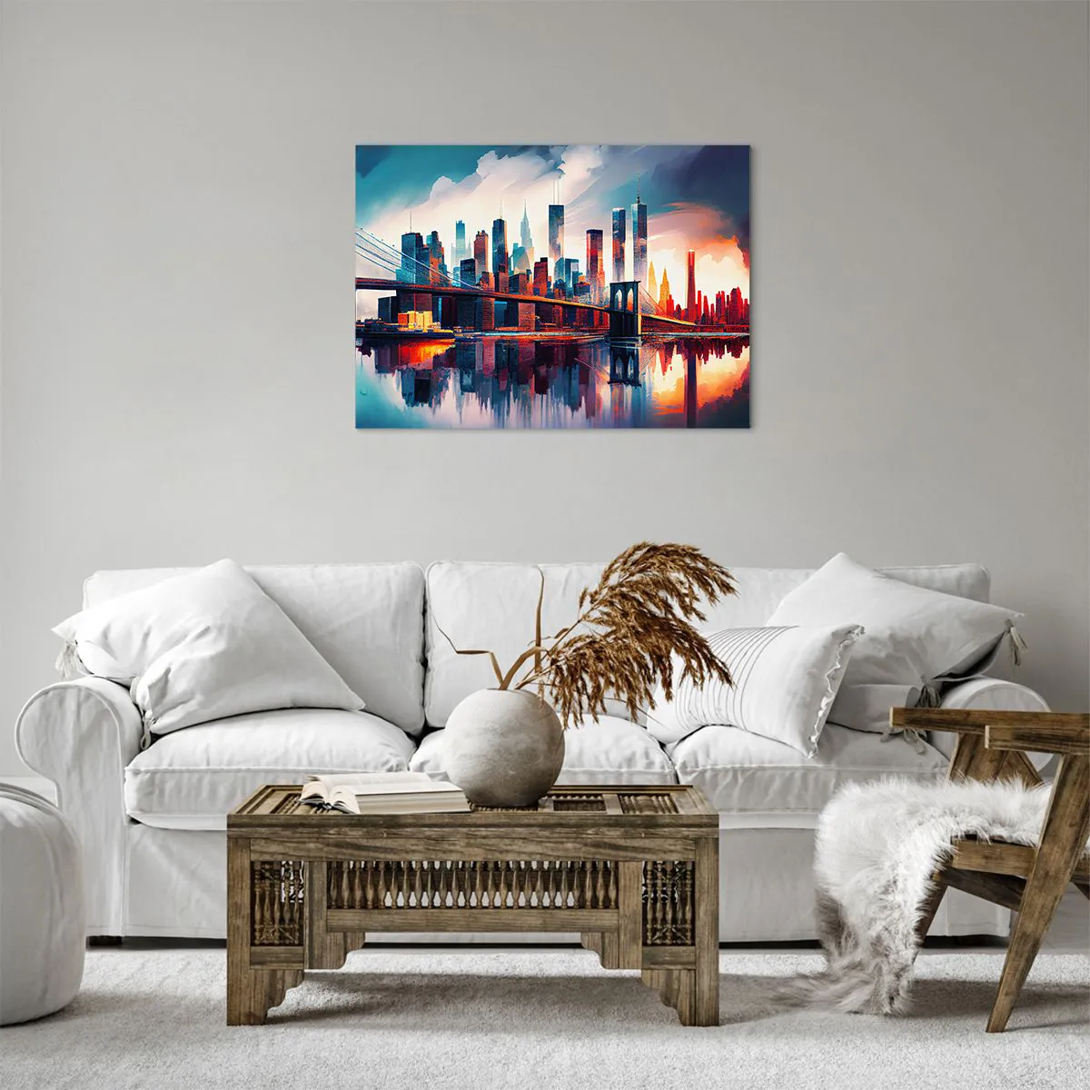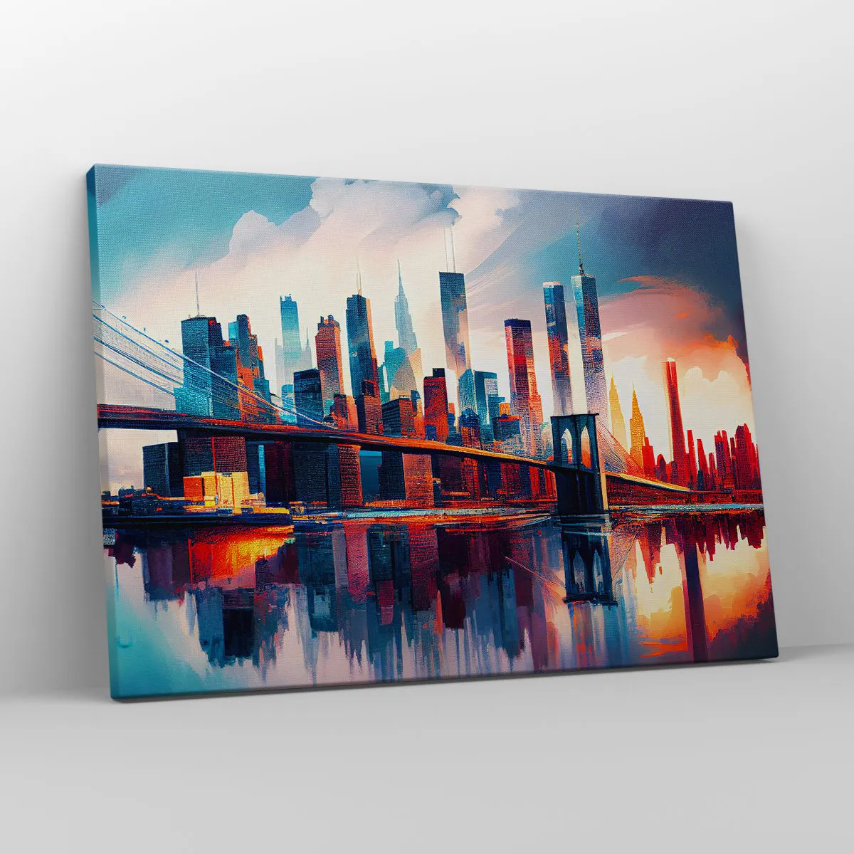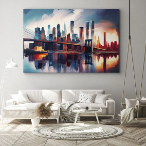 - Plátno s vyobrazením panorámy New Yorku s mostom a odrazom vo vode. Dokonalý doplnok do moderného interiéru, ktorý zdôrazňuje mestský štýl.
